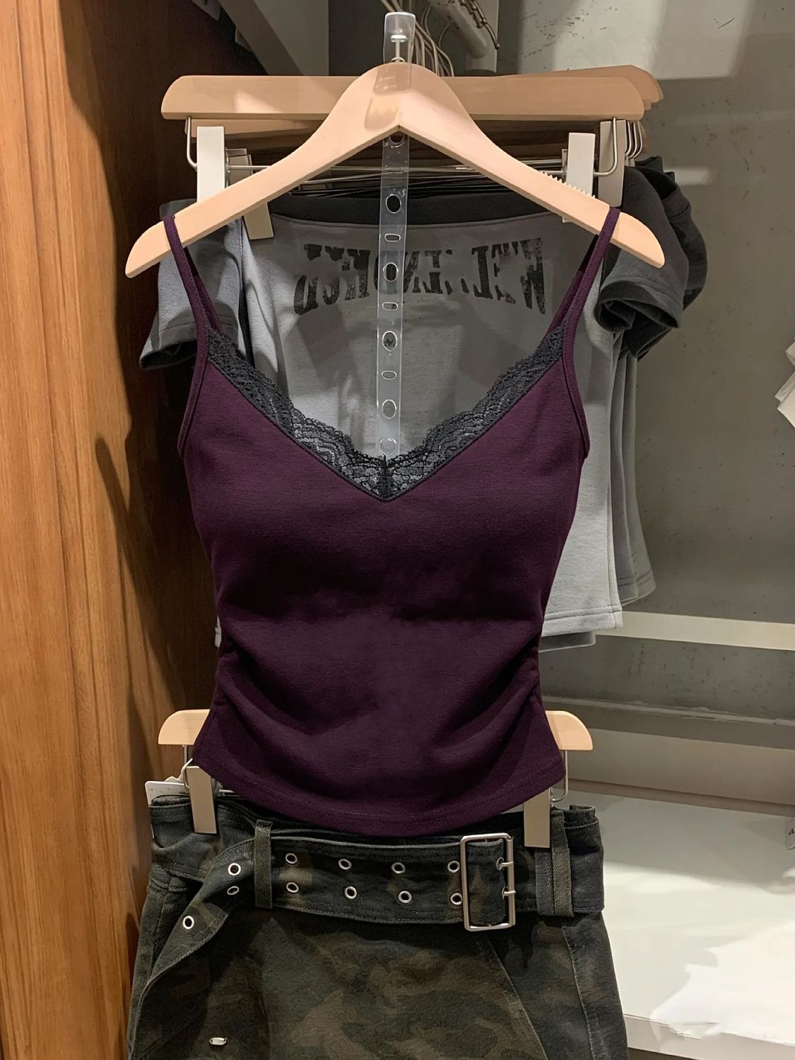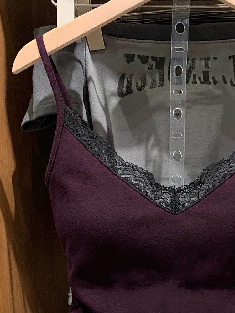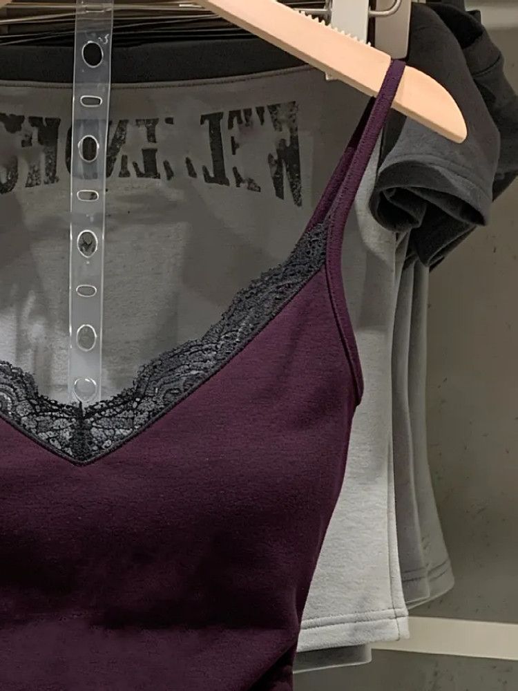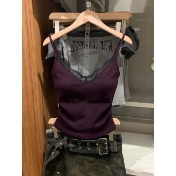 BY16578# 带胸垫V领蕾丝吊带女紧身显瘦辣妹风内搭设计感外穿短款上衣潮 服裝批發女裝批發服飾貨源