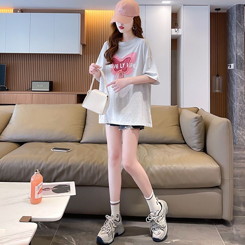 BY16588# 100%纯棉后包领韩版中长款重工印花短袖T恤女 服裝批發女裝批發服飾貨源