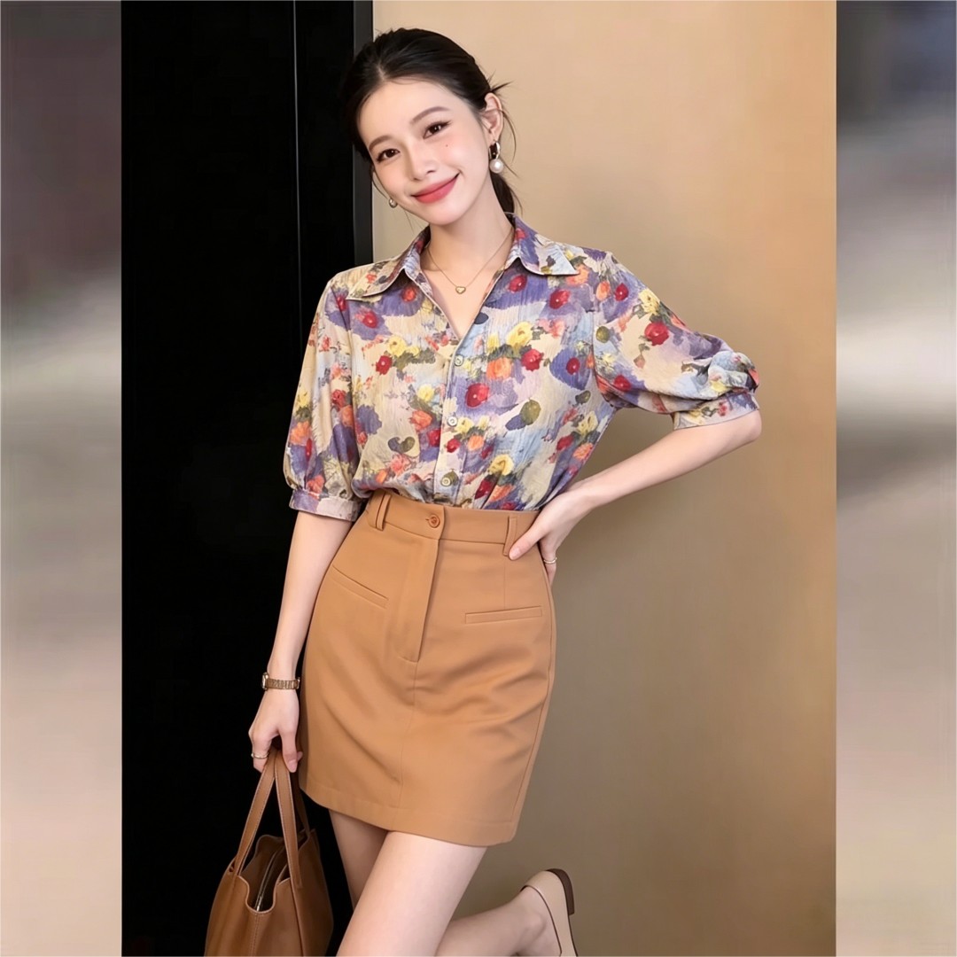 BY16593# 韩式通勤风别致印花翻领短袖衬衫女夏宽松休闲上衣 服裝批發女裝批發服飾貨源