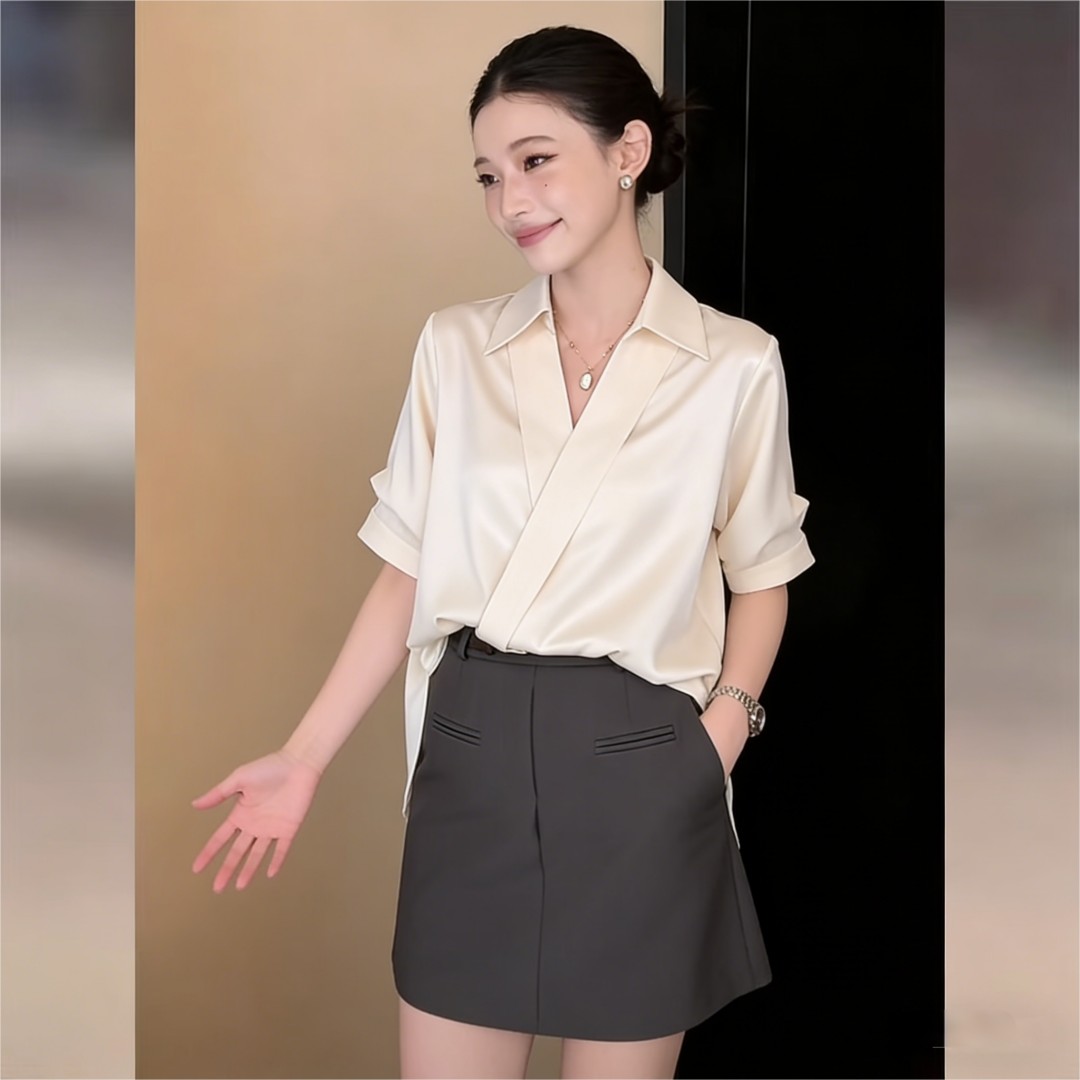 BY16596# 法式翻领短袖衬衫上衣女夏季高级感气质通勤宽松衬衣 服裝批發女裝批發服飾貨源