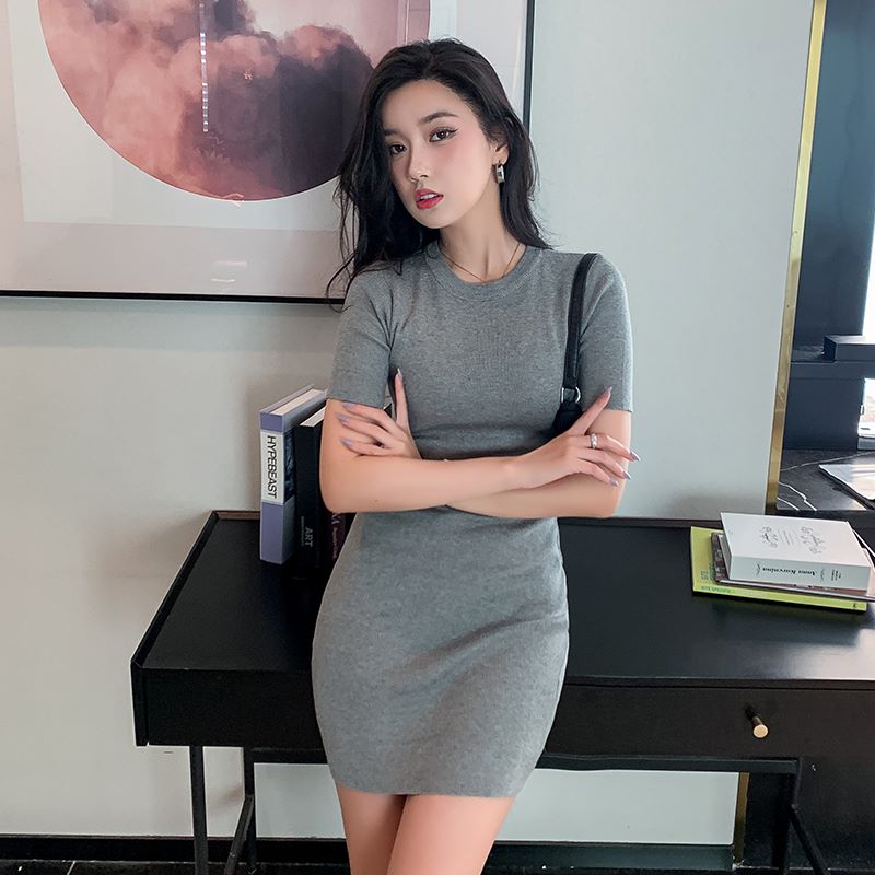 BY16606# 韩版圆领短袖百搭性感修身包臀显瘦中长针织连衣裙 服裝批發女裝批發服飾貨源