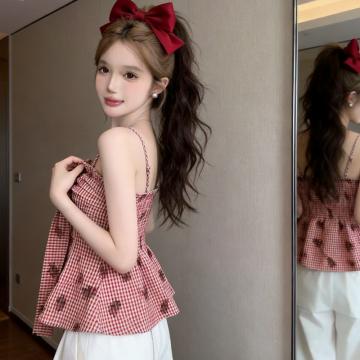 BY16609# 纯欲甜美复古红色印花短款格纹蝴蝶结法式吊带背心上衣女 服裝批發女裝批發服飾貨源
