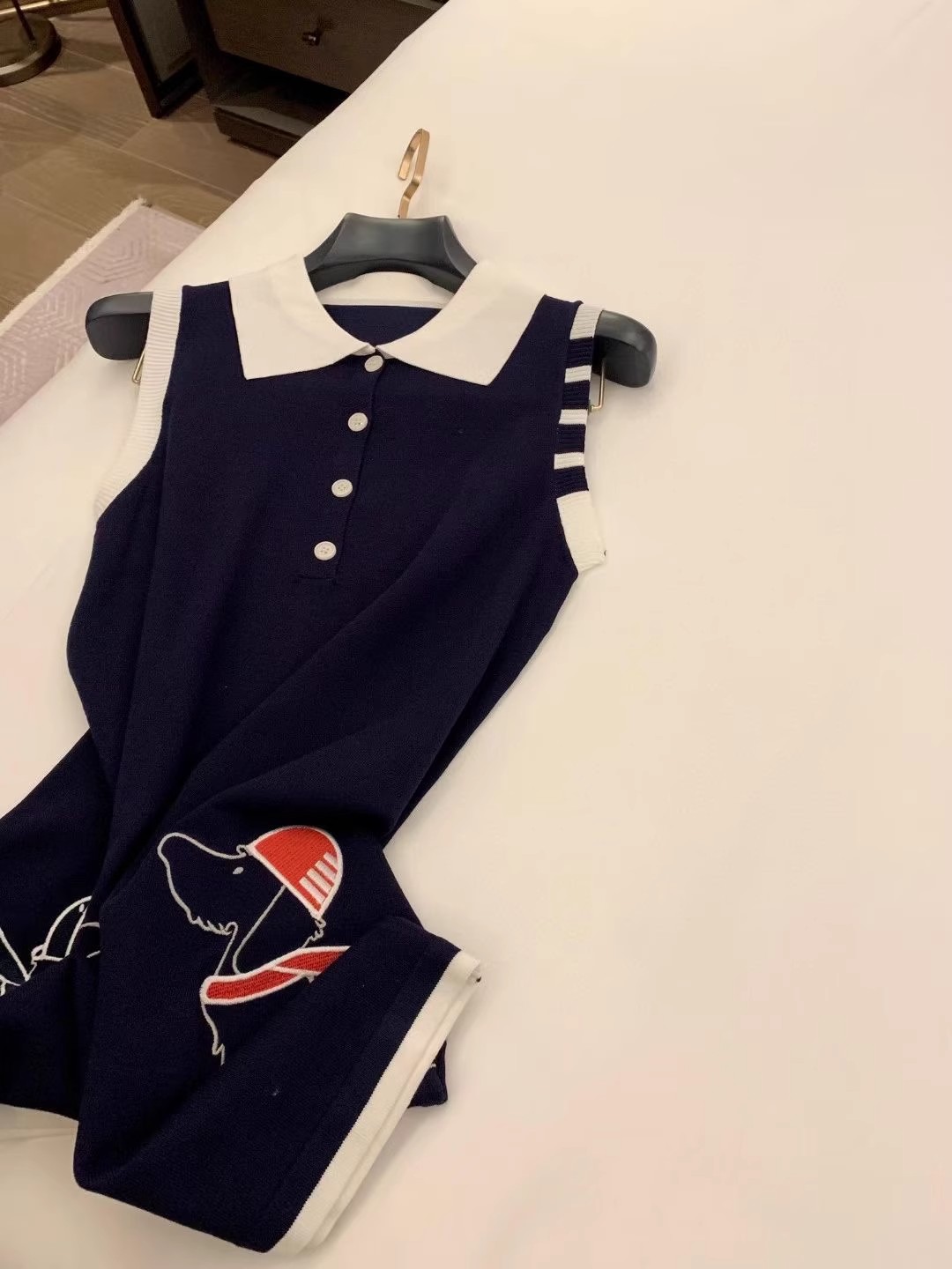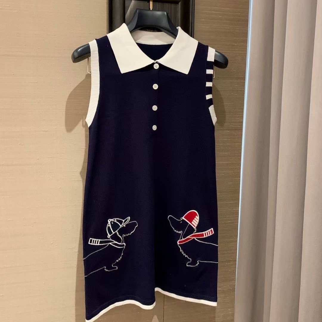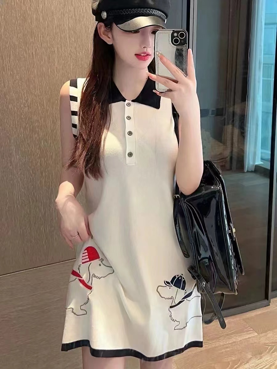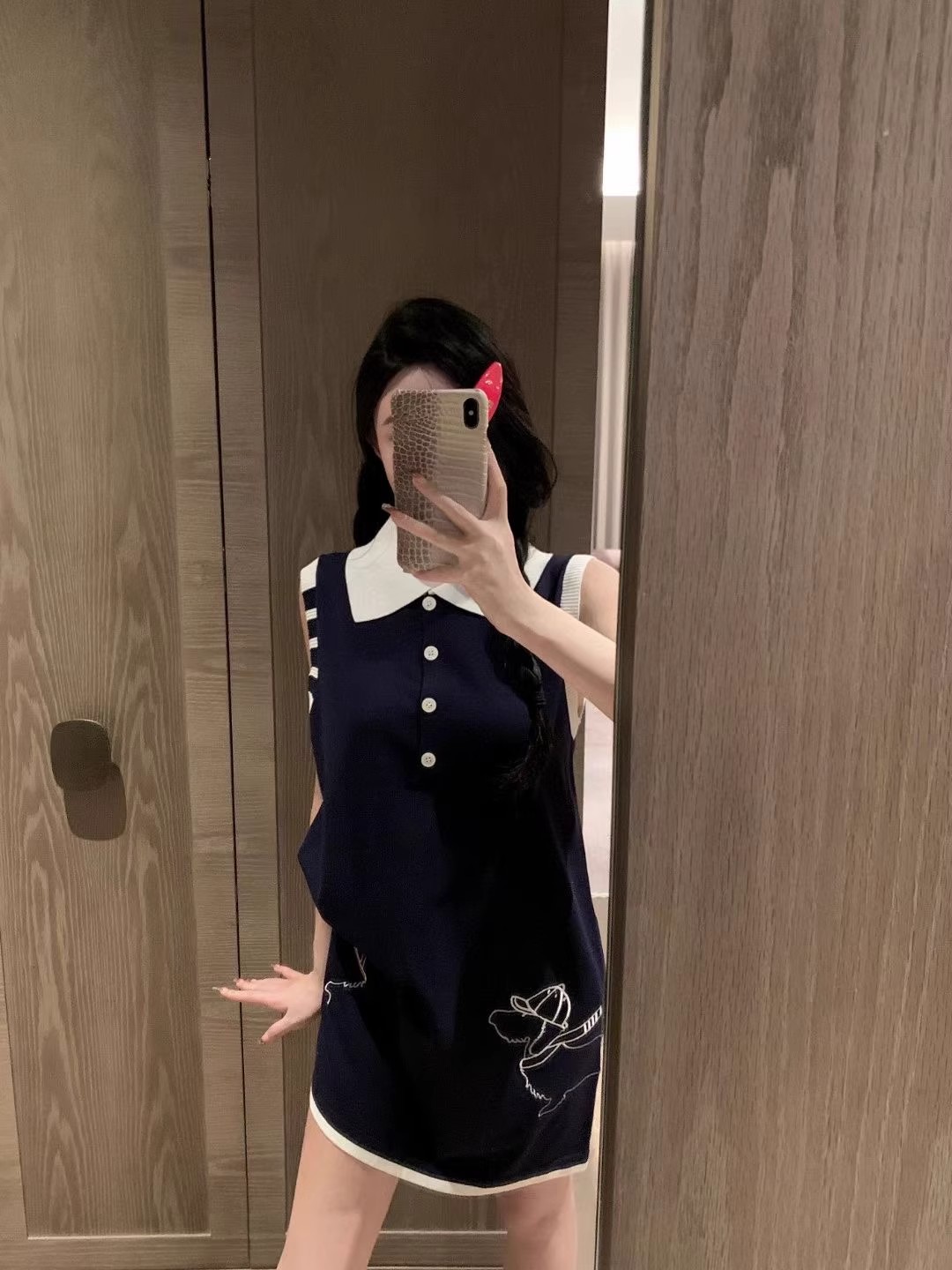 BY16612# 撞色刺绣小狗针织无袖连衣裙女休闲夏季新款POLO领无袖背心裙 服裝批發女裝批發服飾貨源