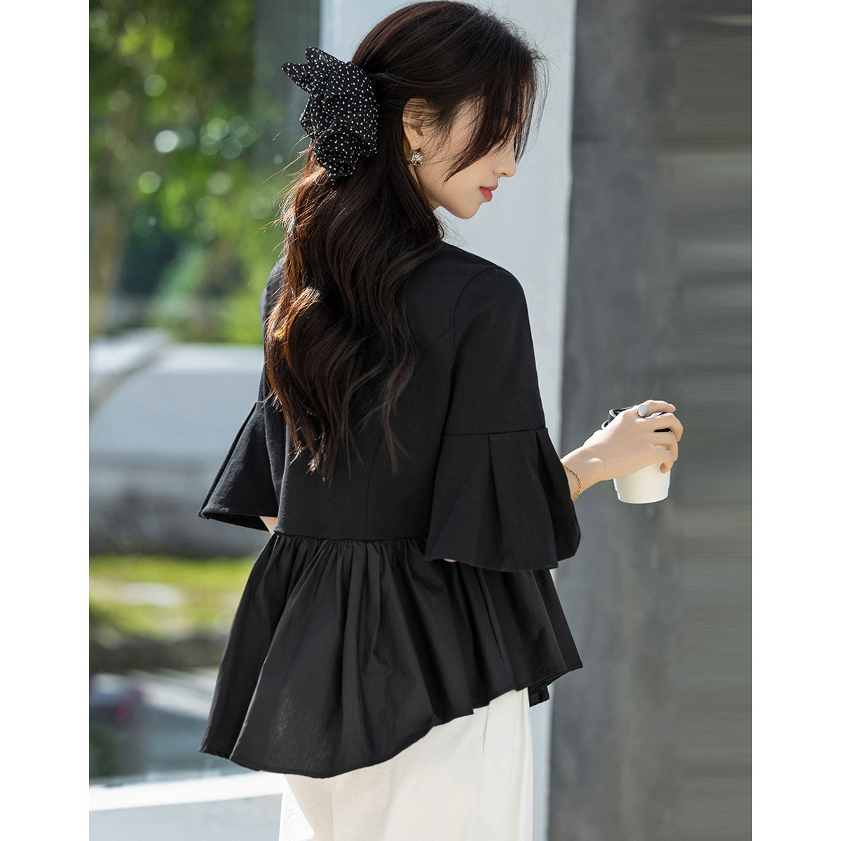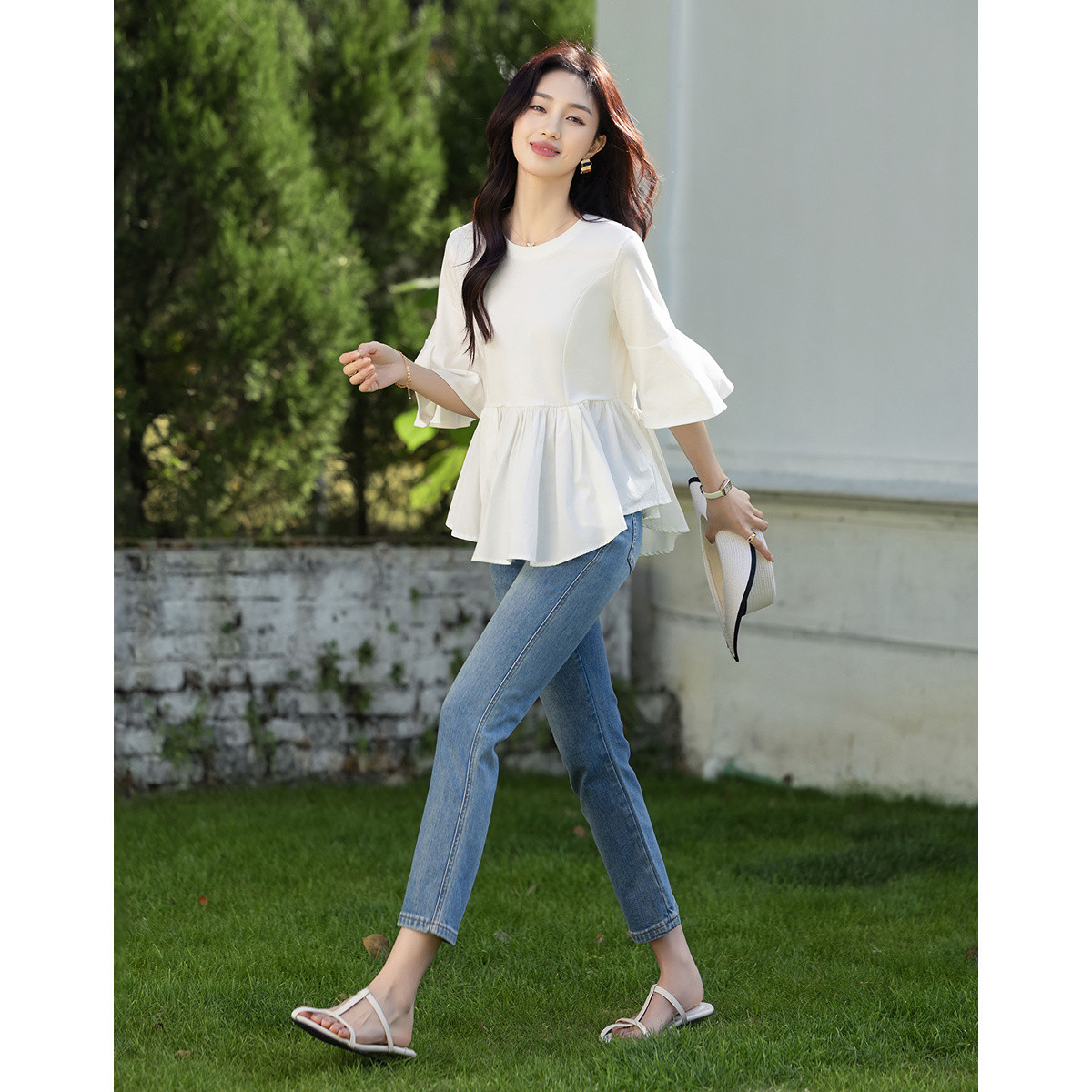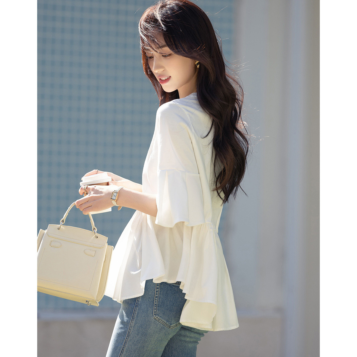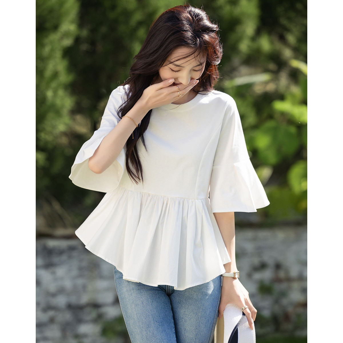 BY16614# 夏季轻熟风设计感拼接五分袖宽松遮肉小个子女式t恤 服裝批發女裝批發服飾貨源