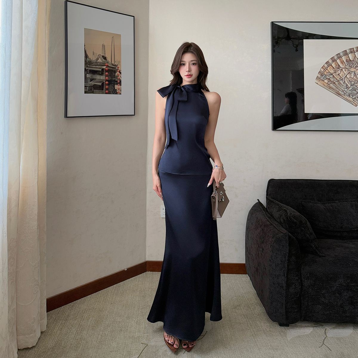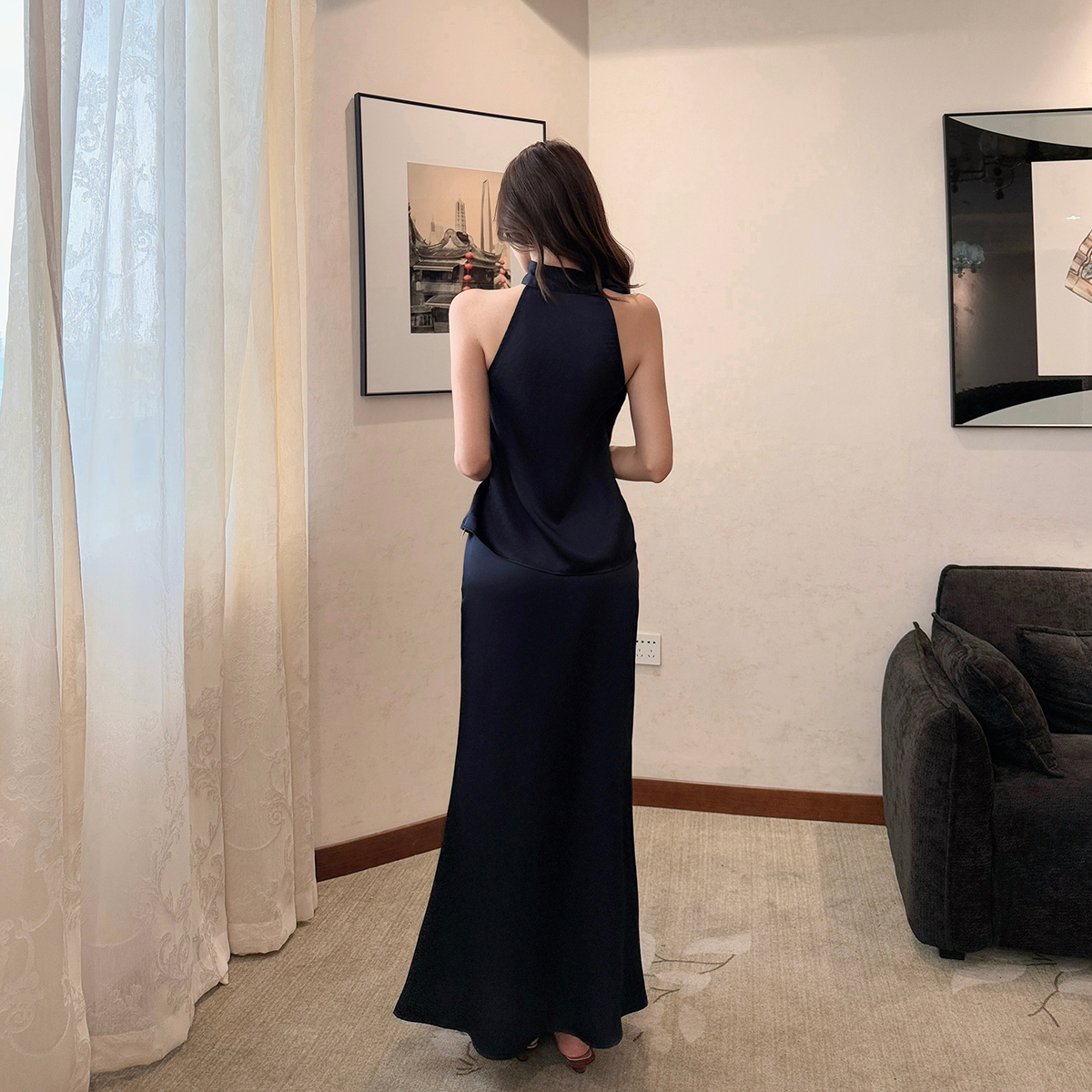 BY16632# 蓝鸢尾缎面挂脖圆领无袖上衣高腰包臀垂感半裙两件套装 服裝批發女裝批發服飾貨源