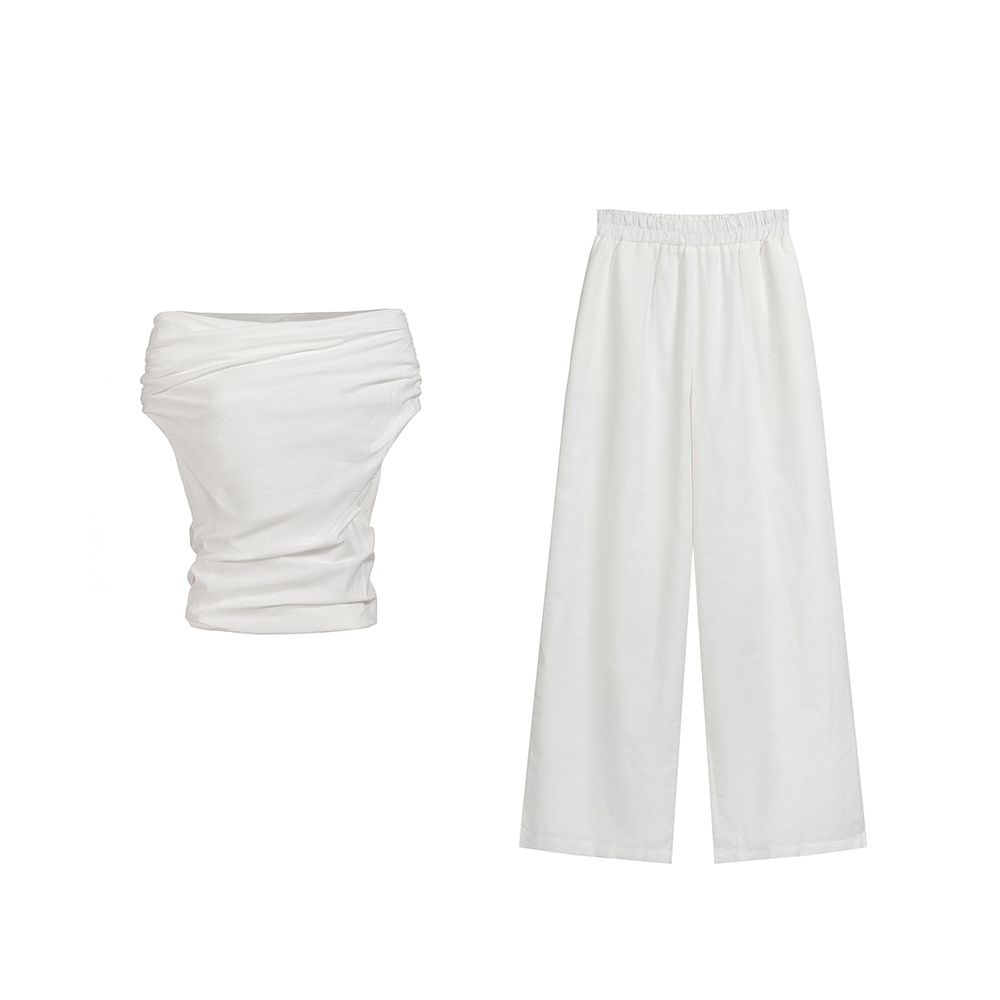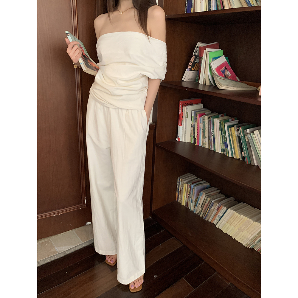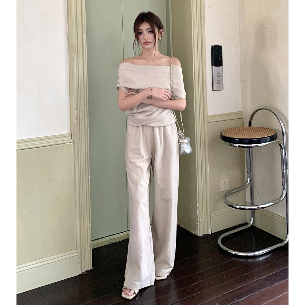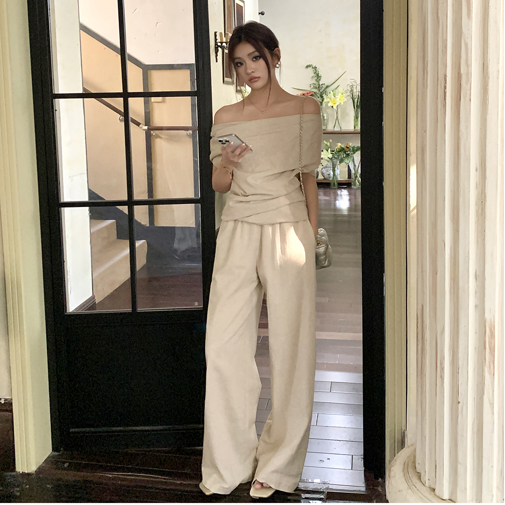 BY17331# 春夏新款慵懒舒适女一字斜肩褶皱上衣直筒长裤两件套装