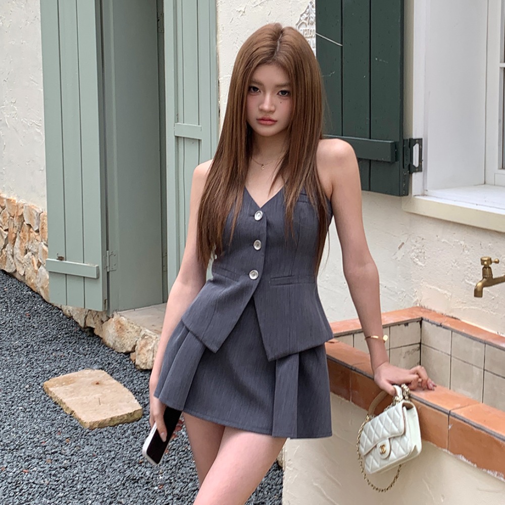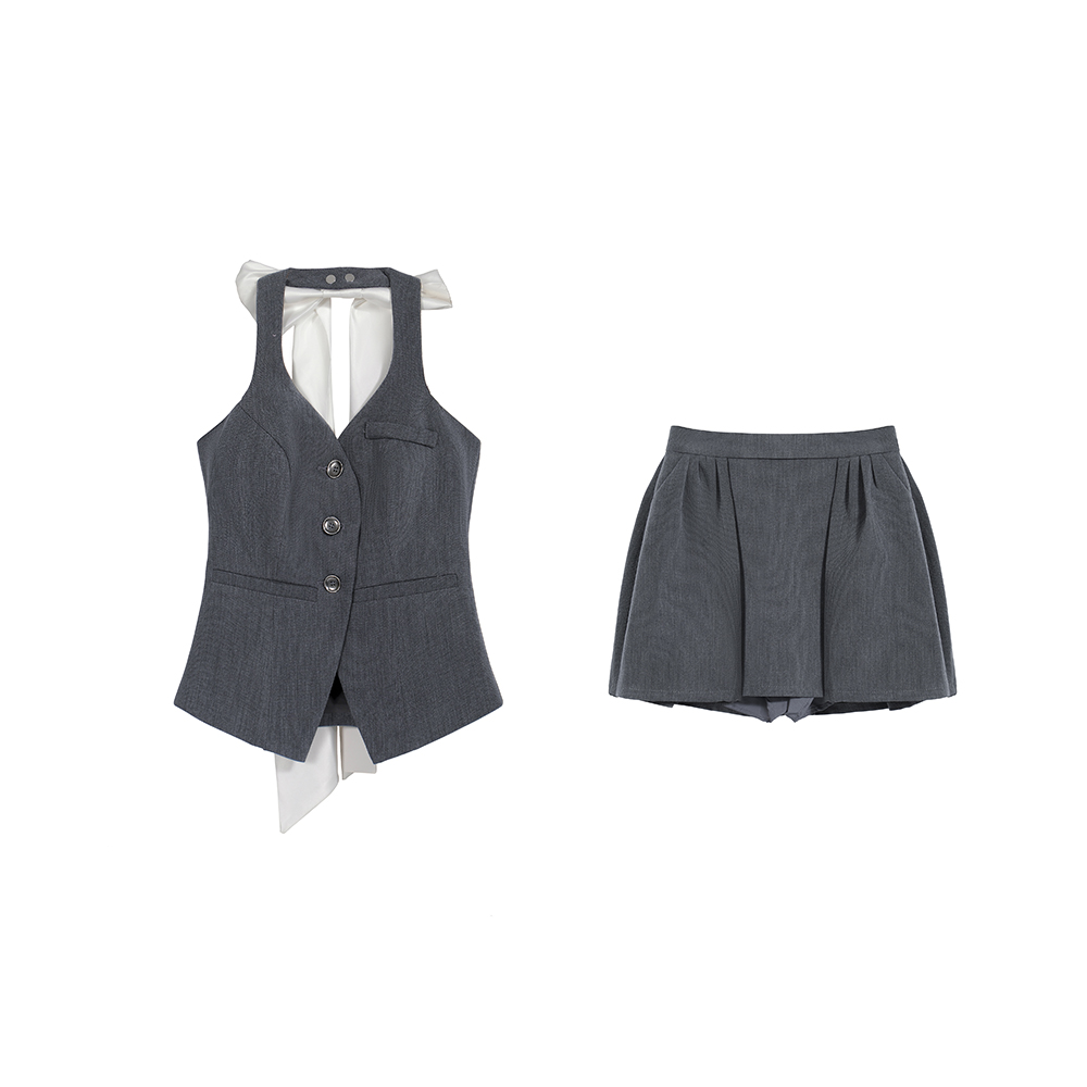 BY17333# 春夏新款蝴蝶结可多用西装马甲挂脖百褶短裙半身裙女套装