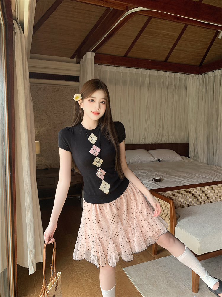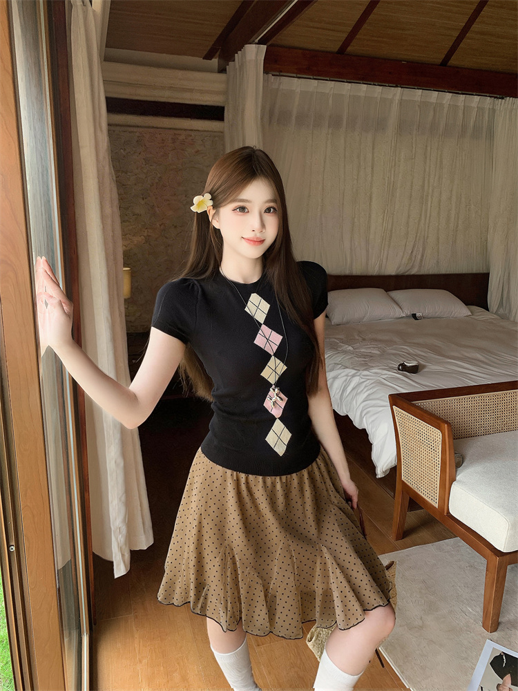 BY17338# 黑色正肩菱格冰丝针织短袖T恤波点不规则荷叶边半身裙两件套