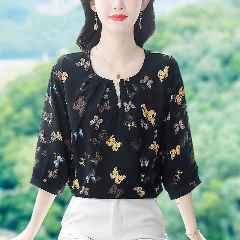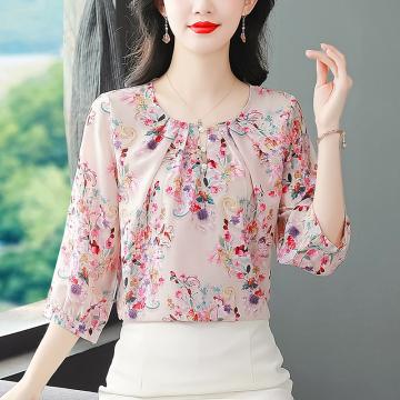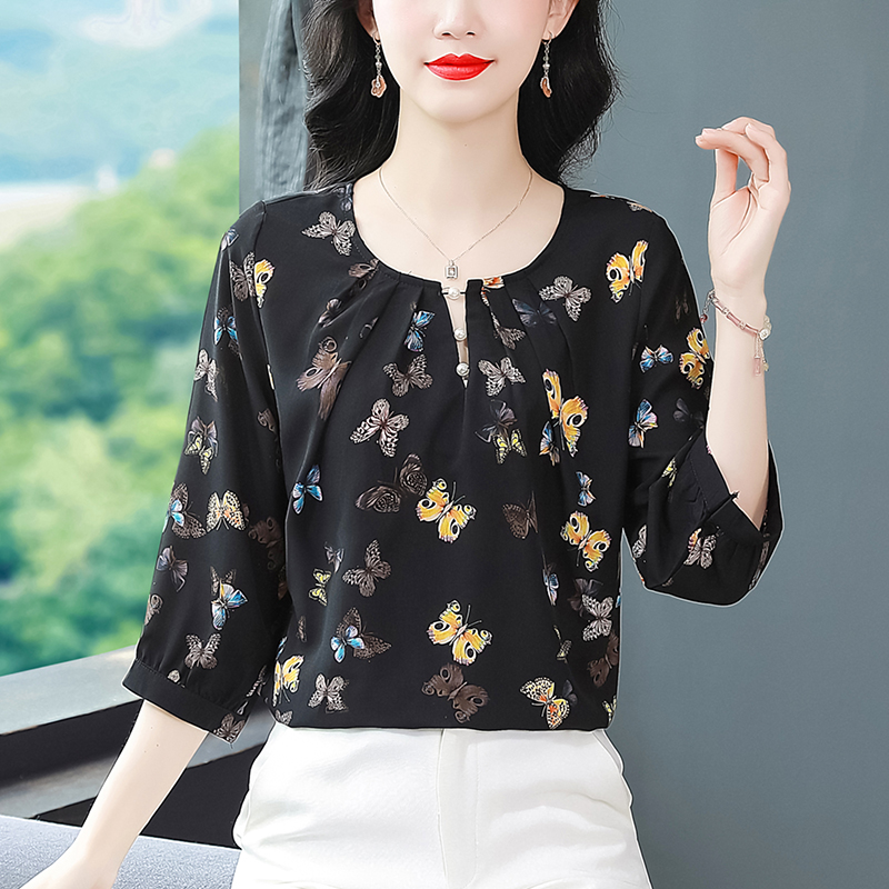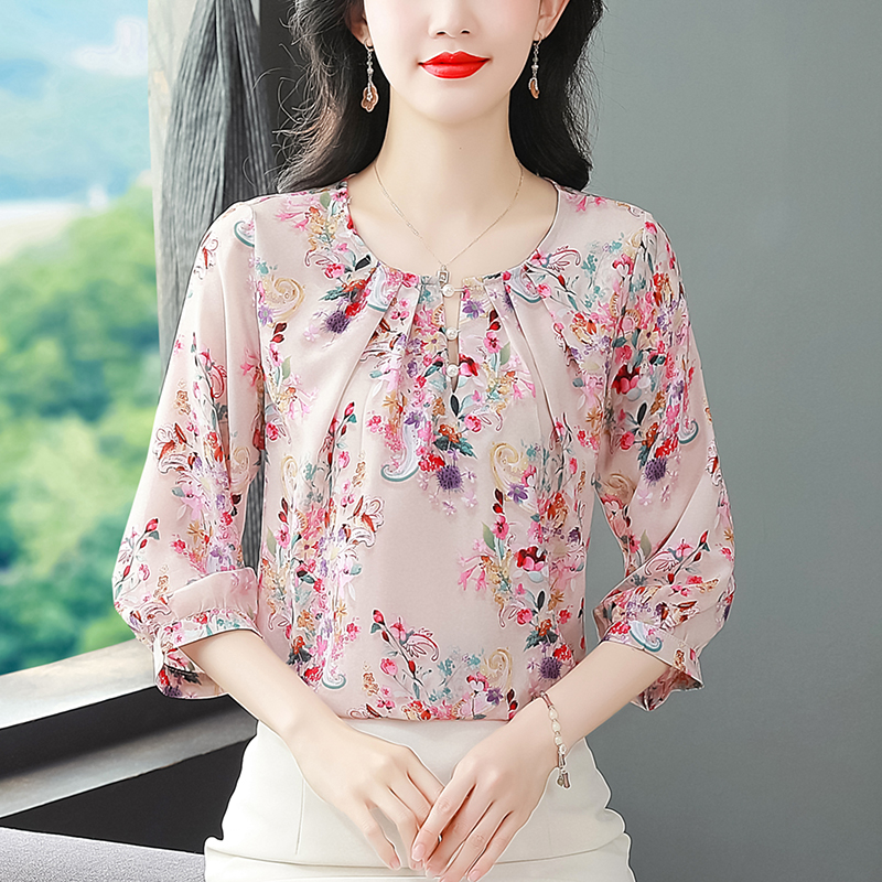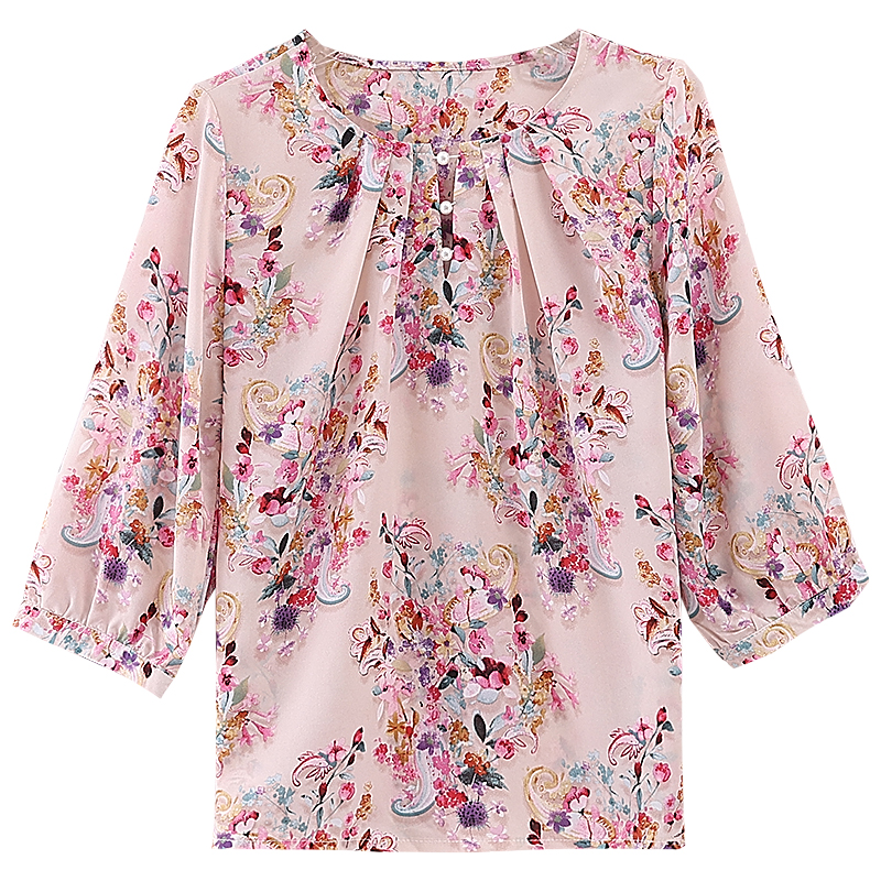 BY17379# 洋气印花衬衫新款复古遮肉显瘦套头打底上衣气质小衫