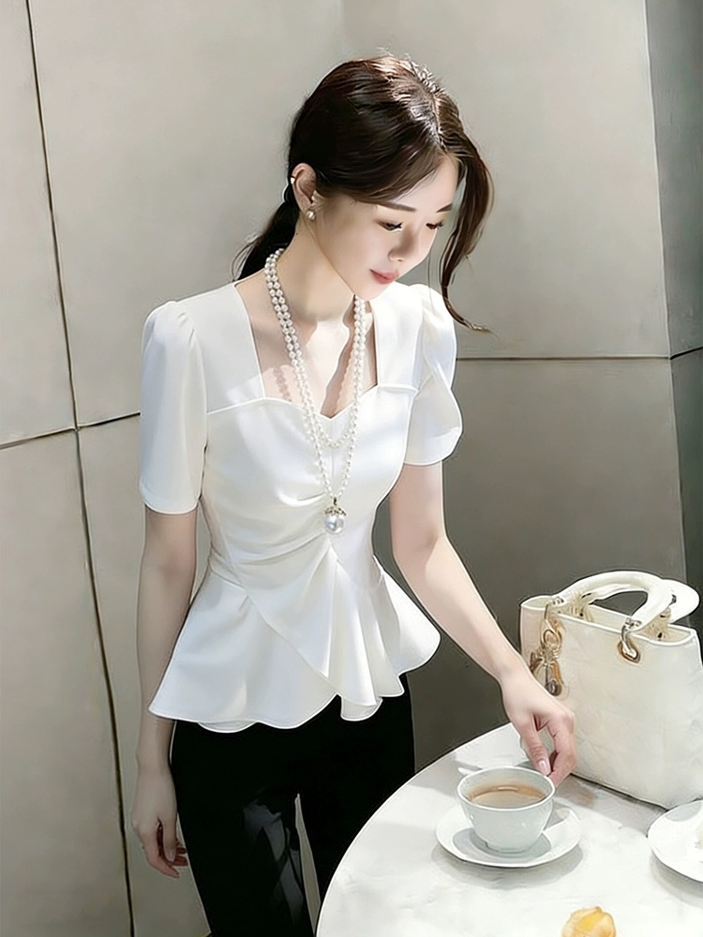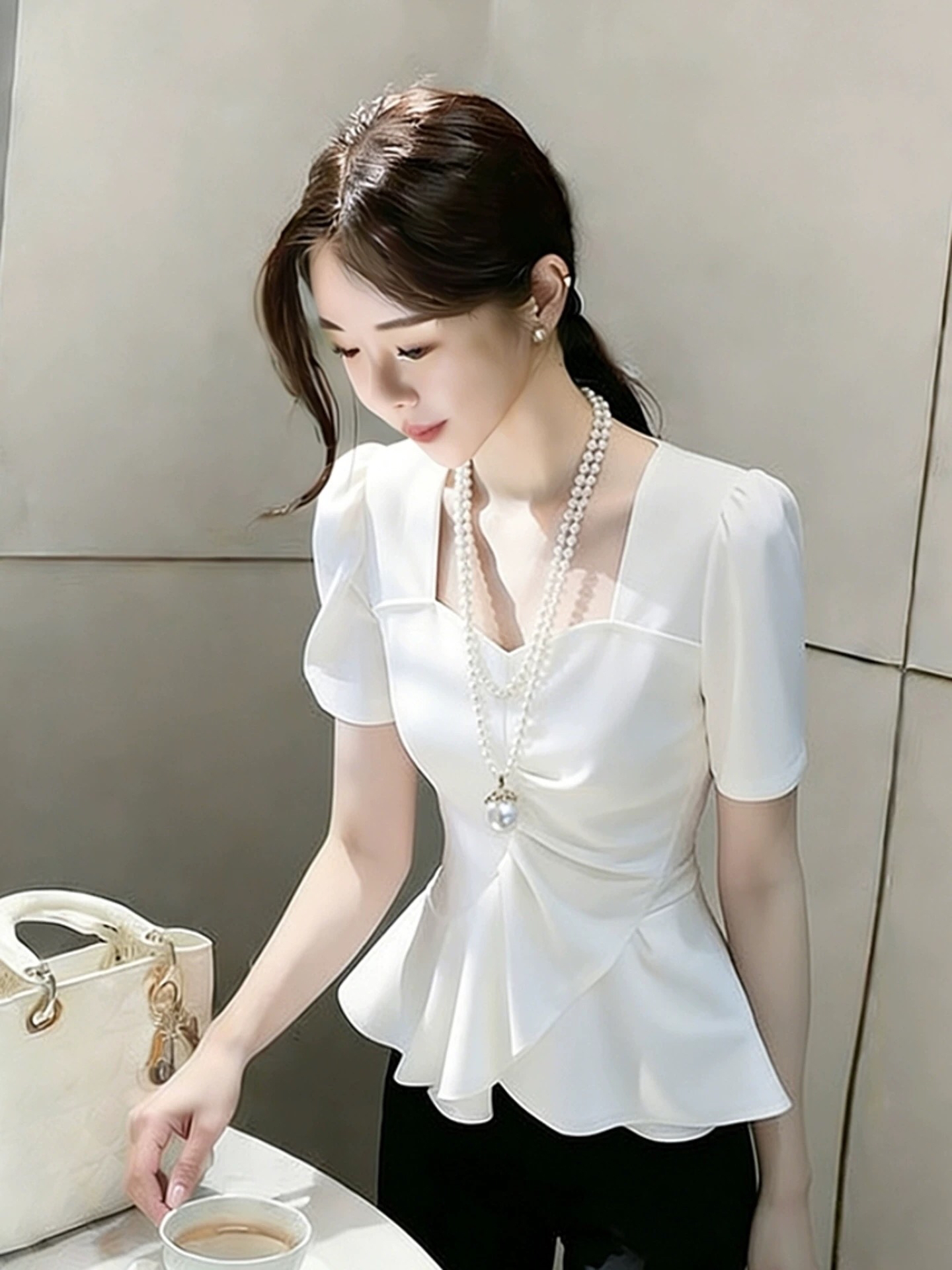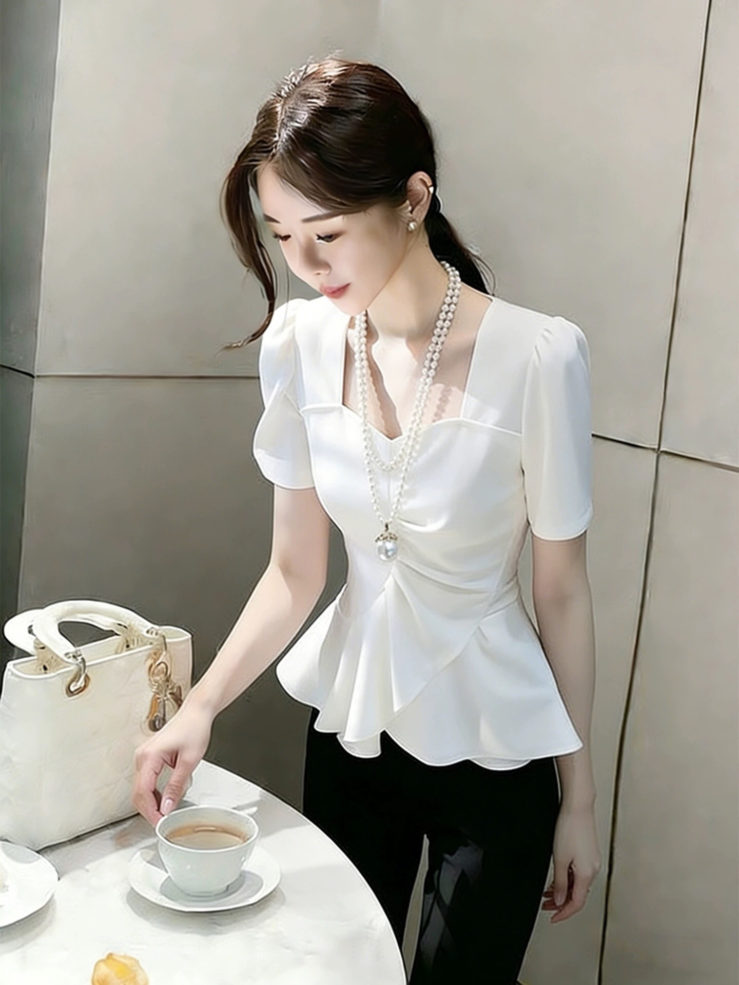 BY17380# 时尚洋气高端精致白色荷叶边上衣春季新款法式小资收腰衬衫女