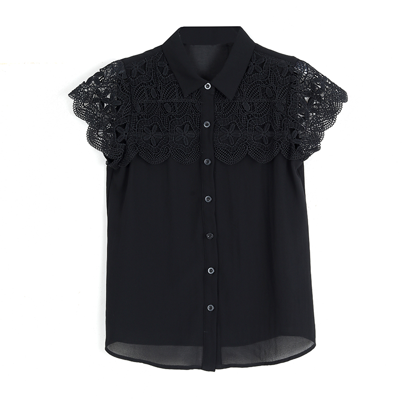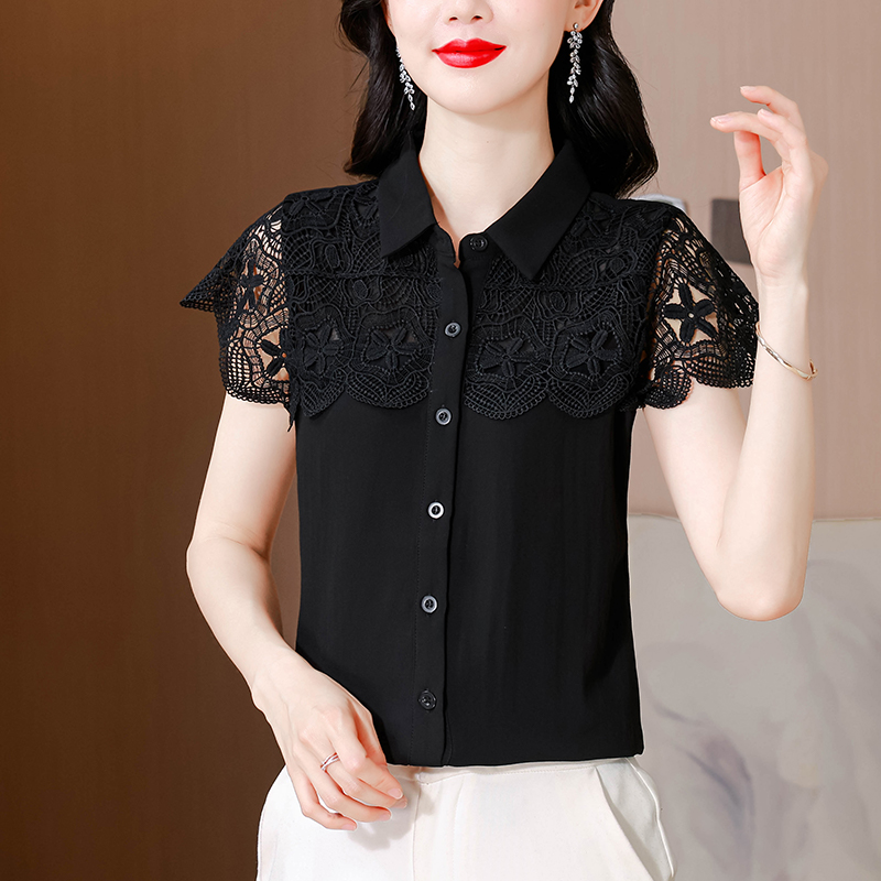 BY17395# 复古刺绣网纱拼接短袖衬衫女夏季新款黑色设计感宽松减龄上衣