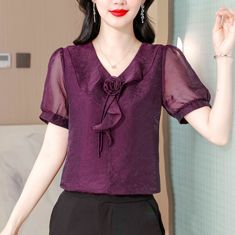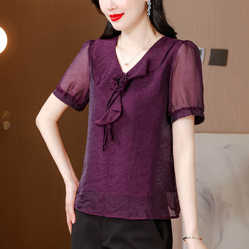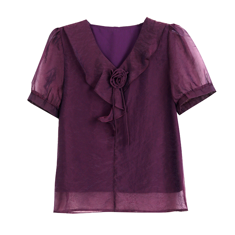 BY17396# 港风复古玫瑰花朵紫色短袖衬衫女夏款气质显瘦衬衣小众上衣