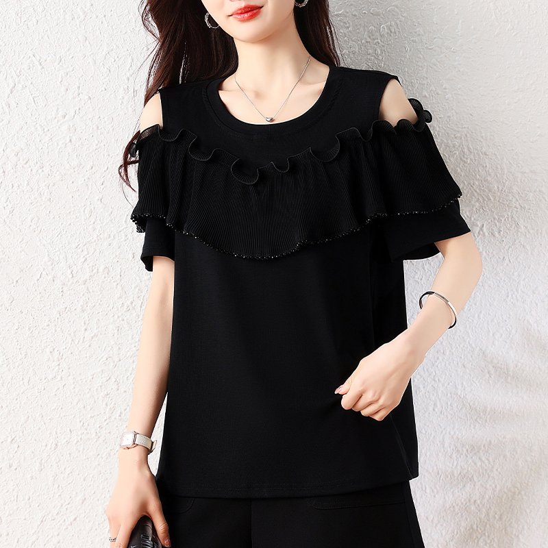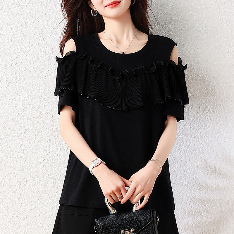首页 > 短袖T恤 > BY17403# 夏季新款圆领荷叶边压褶露肩显瘦遮肉大码时尚T恤上衣女