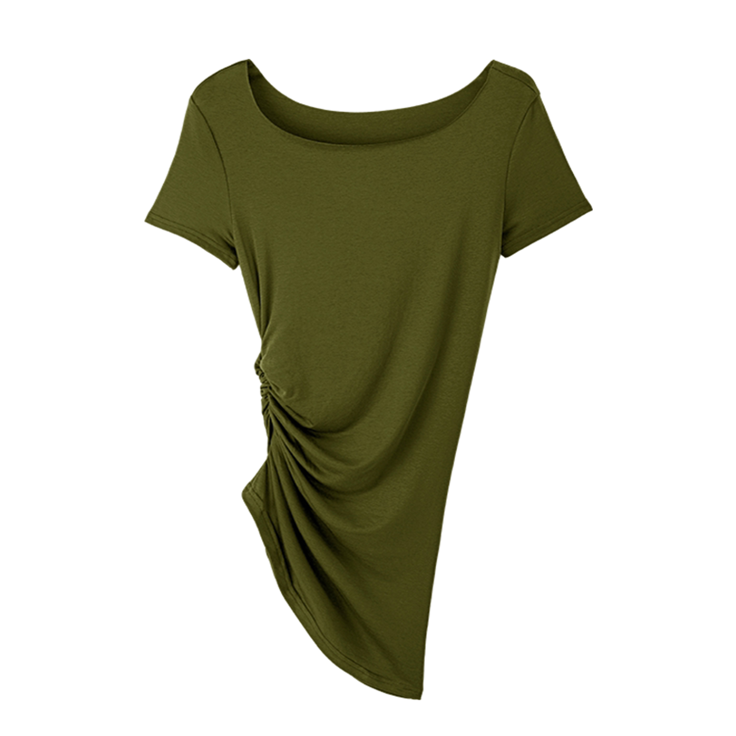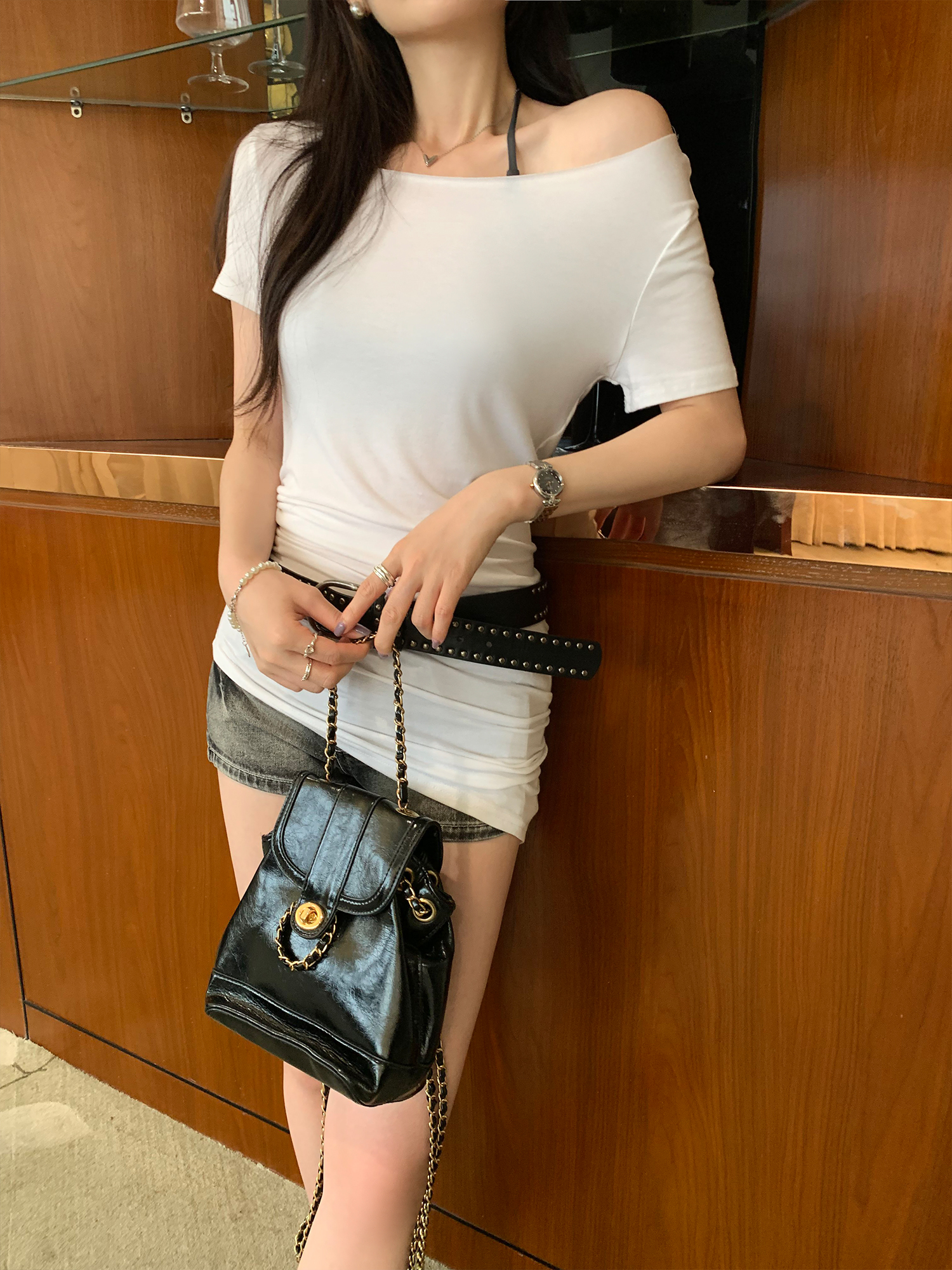 BY17405# 图莱赛尔天丝羊毛独特抽褶斜领短袖T恤女夏新款露肩上衣