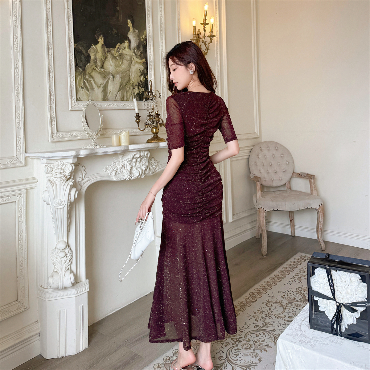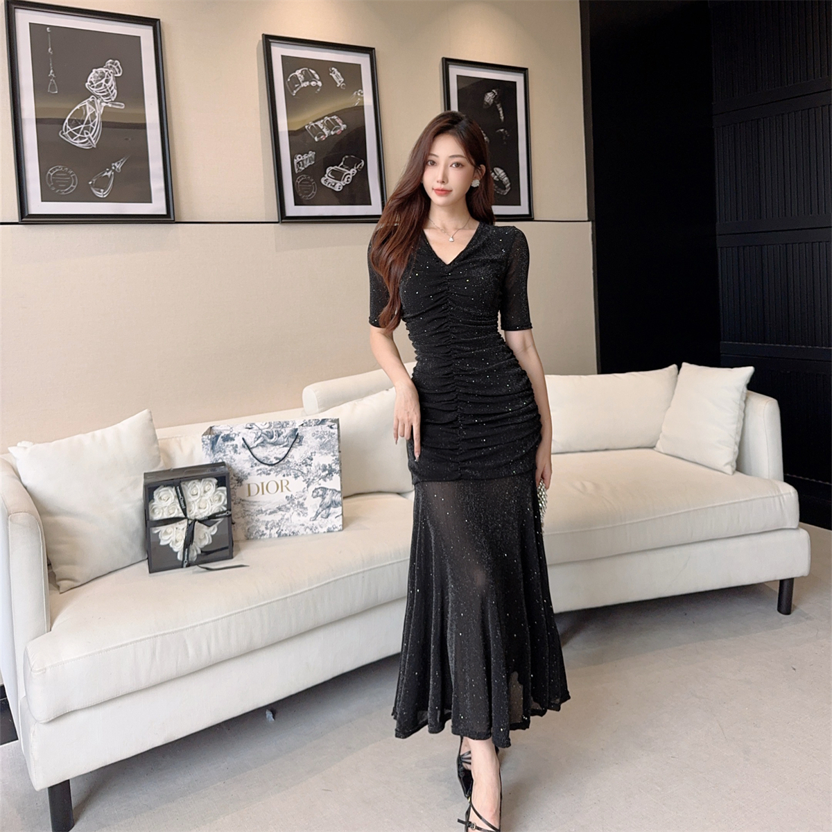 BY17407# 名媛风V领褶皱连衣裙女亮片修身包臀鱼尾裙晚宴年会礼服裙