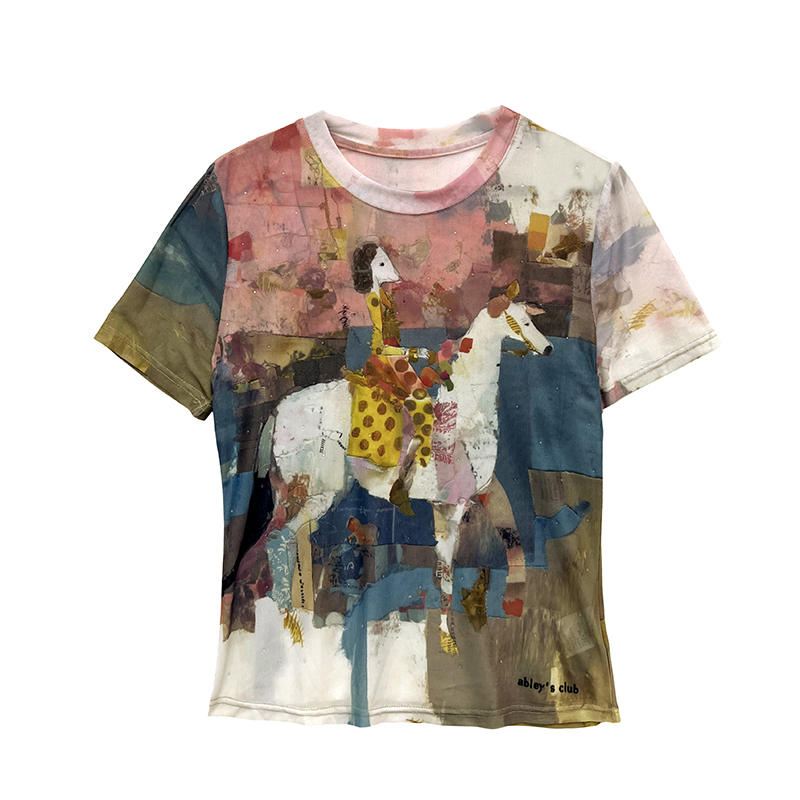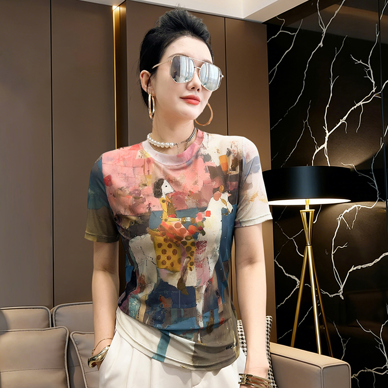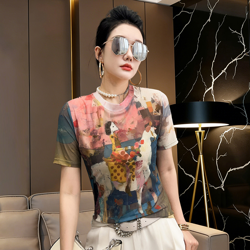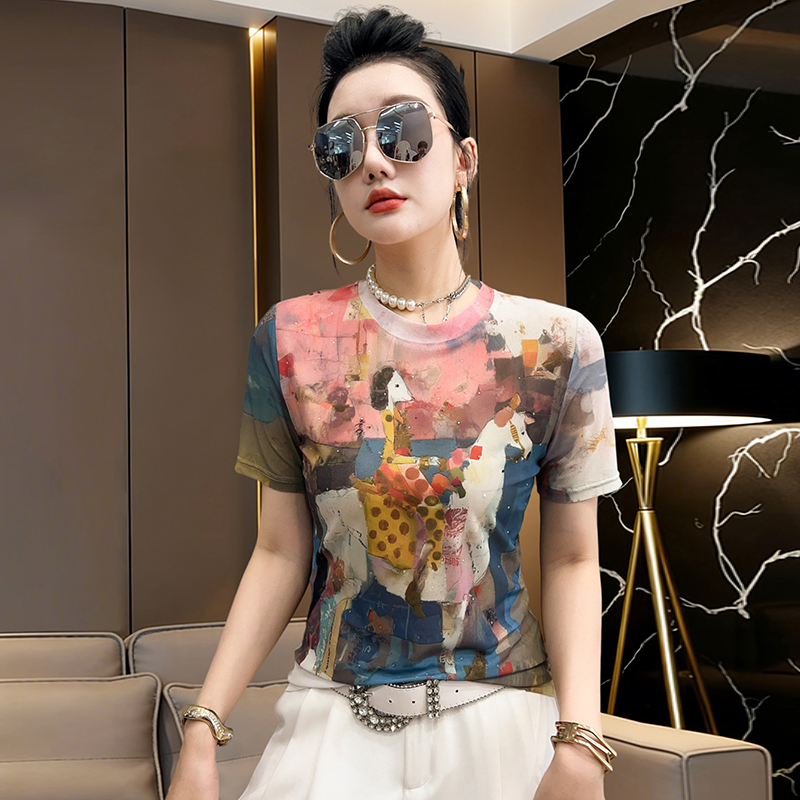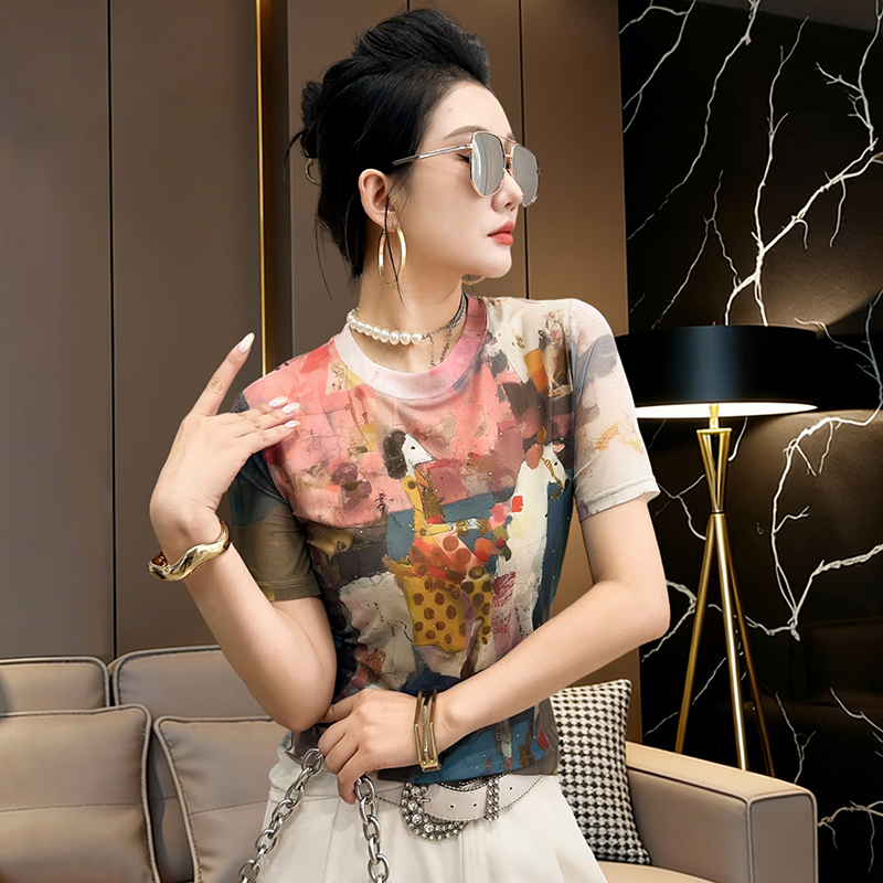 BY17416# 白马印花网纱短袖T恤女夏季超火减龄时尚显瘦气质烫钻上衣潮
