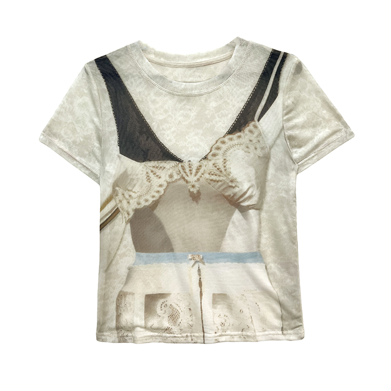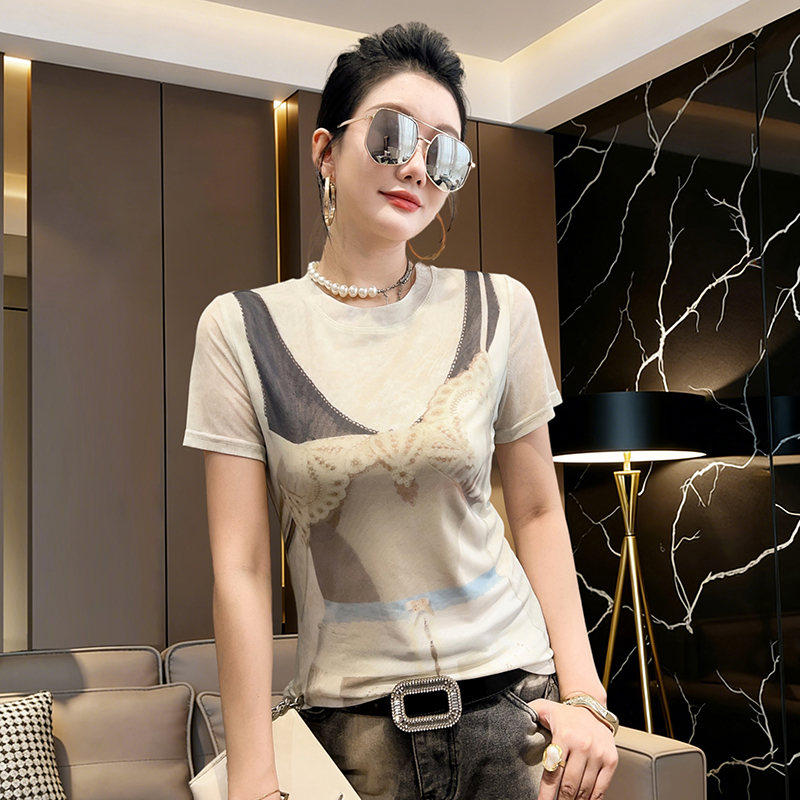 BY17417# 欧货夏季时尚纱网印花定位花短袖圆领修身显瘦洋气上衣潮
