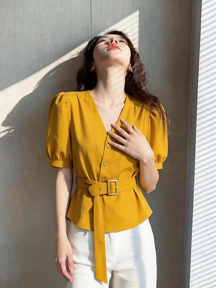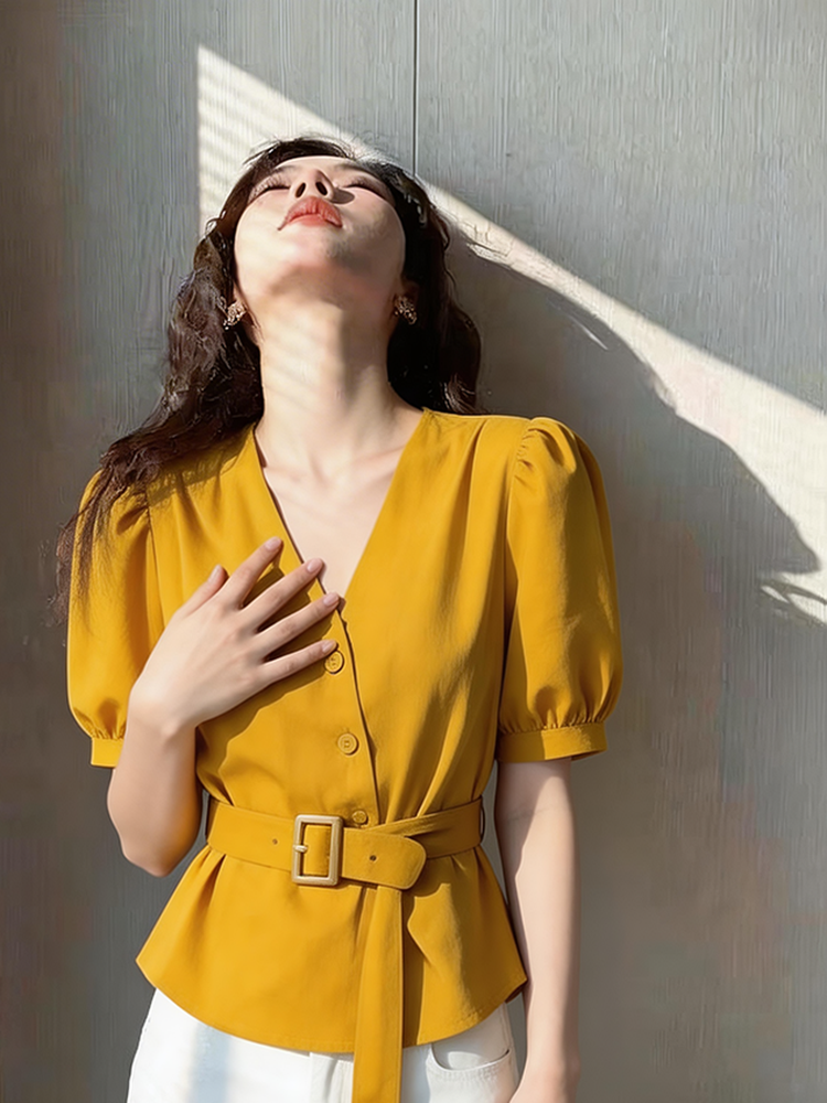 BY17425# 夏季法式复古收腰显瘦v领泡泡短袖西装衬衫女设计感小众绝美上衣