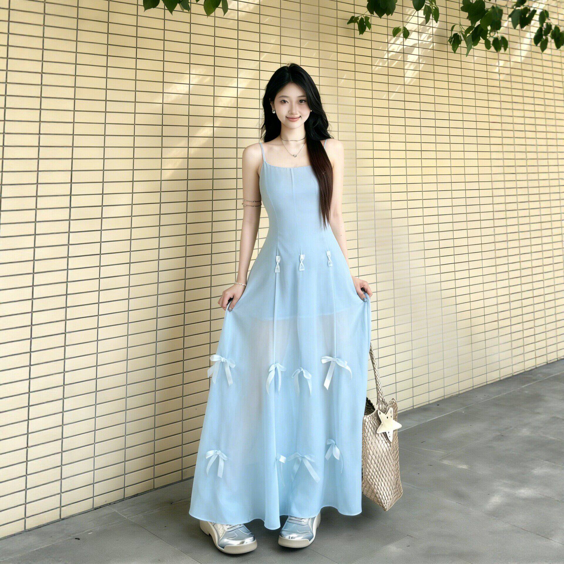 BY18814# 法式一裙三穿气质蓝色吊带连衣裙夏海边度假独特绝美收腰a字长裙 服裝批發女裝批發服飾貨源