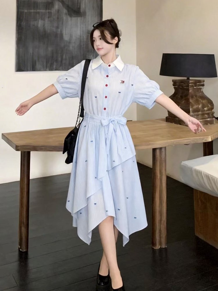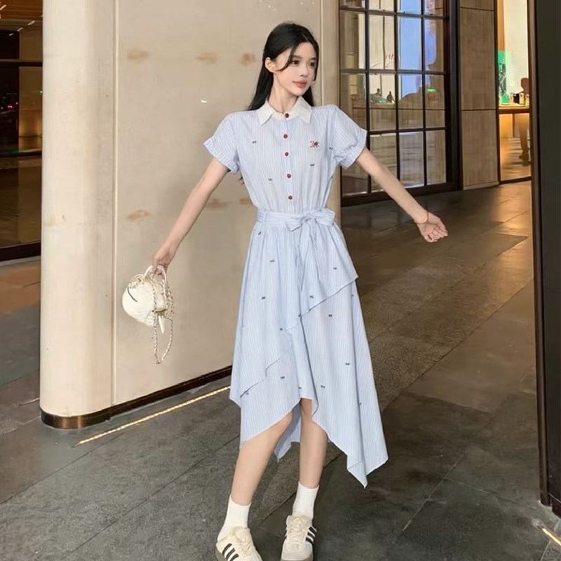 BY18830# 学院风条纹翻领衬衫连衣裙女夏季新款设计感不规则下摆裙子 服裝批發女裝批發服飾貨源