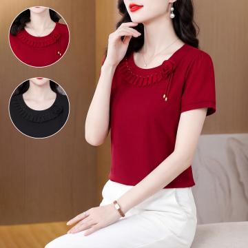 BY18857# 夏季新款T恤短袖圆领设计感玫瑰遮肉显身材气质百搭上衣 服裝批發女裝批發服飾貨源