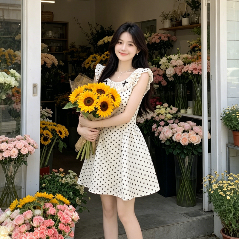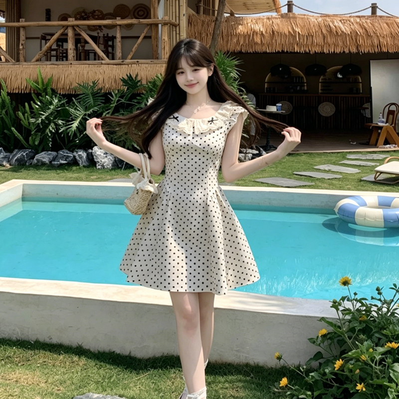 BY18873# 夏季波点连衣裙蕾丝花边蝴蝶结甜妹A字裙修身显瘦小个子短裙 服裝批發女裝批發服飾貨源