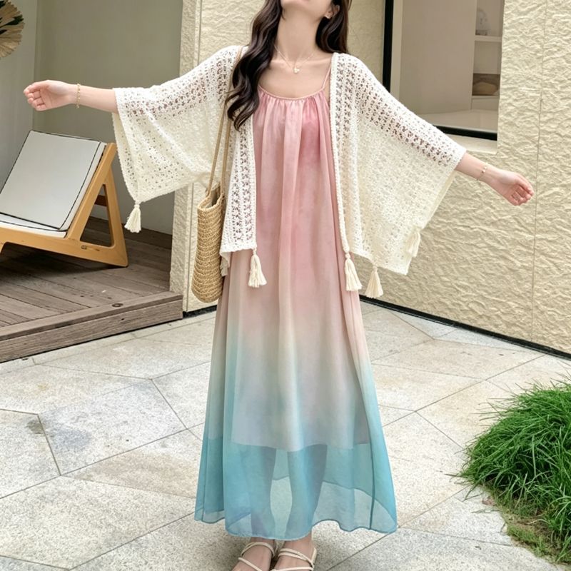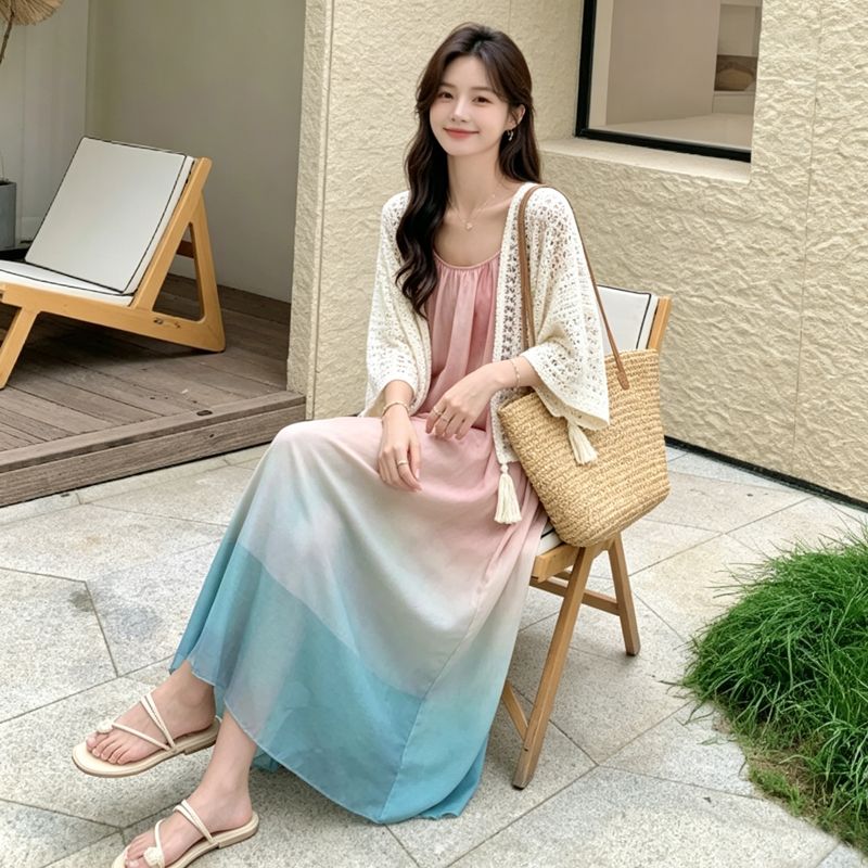BY18875# 法式甜美渐变吊带连衣裙女夏季高级感气质海边度假绝美仙女长裙 服裝批發女裝批發服飾貨源