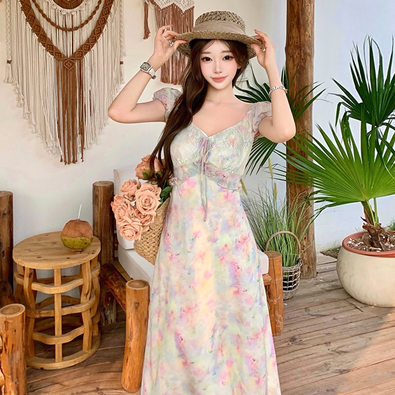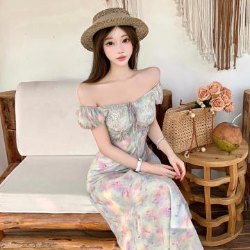 BY18910# 夏季法式优雅晕染珠光亮面浪漫气质短袖一字肩连衣裙微收腰连衣裙 服裝批發女裝批發服飾貨源