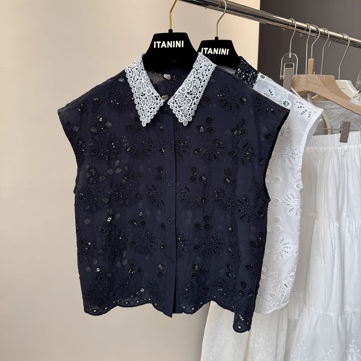 BY18926# 欧洲站夏季新款女装蕾丝翻领花朵刺绣减龄百搭无袖衬衫 服裝批發女裝批發服飾貨源