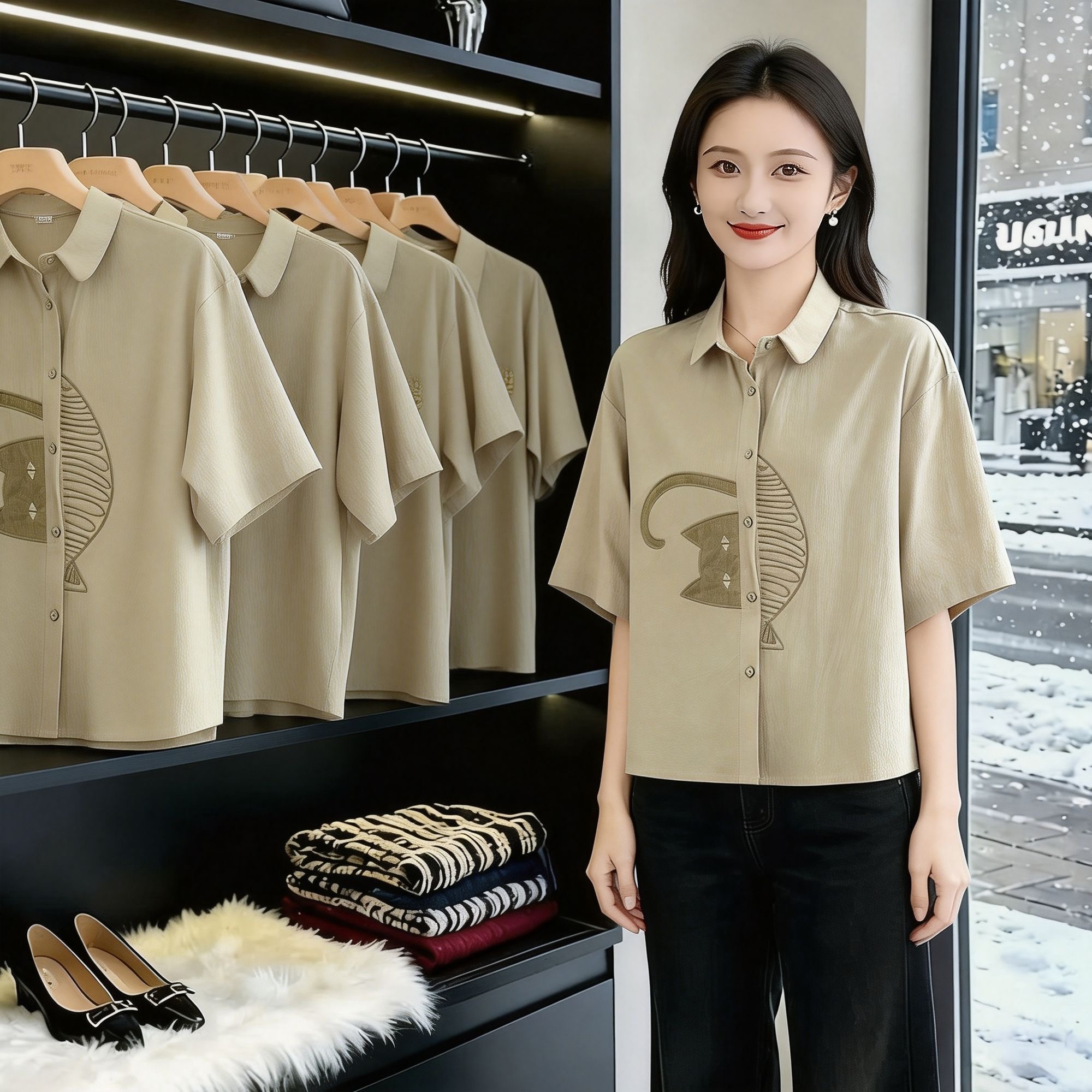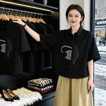BY18928# 胖MM时尚设计感猫咪刺绣可开衫短袖衬衣体恤夏季大码翻领女装 服裝批發女裝批發服飾貨源