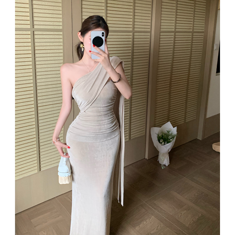 BY18931# 法式飘带斜肩连衣裙修身性感露背包臀纯欲长裙假两件礼服 服裝批發女裝批發服飾貨源