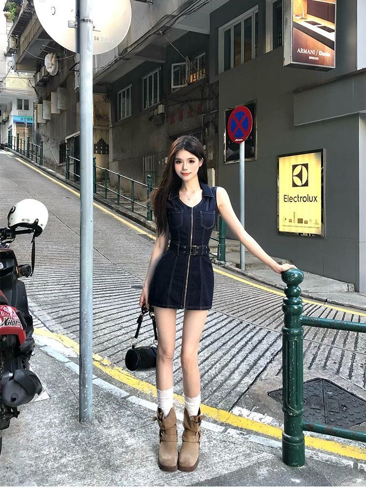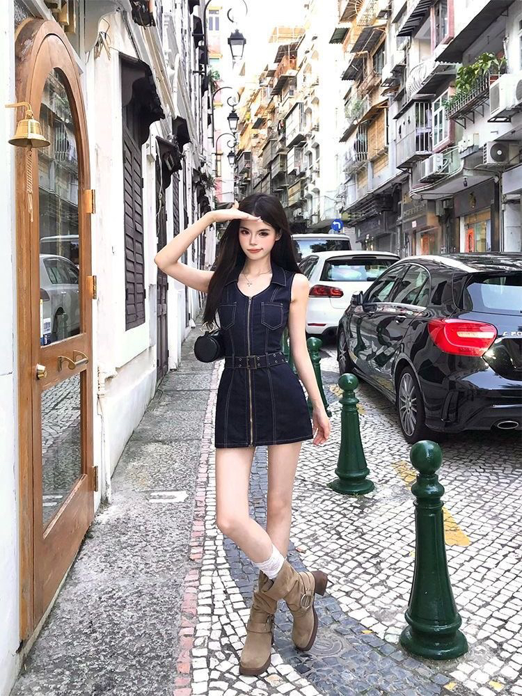 BY18942# 复古通勤小众牛仔连衣裙辣妹夏季新款拉链设计收腰短裙显瘦牛仔裙 服裝批發女裝批發服飾貨源
