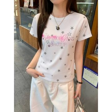 BY18970# 美式烫钻满印星星正肩短袖T恤女夏季设计感小众修身显瘦百搭上衣 服裝批發女裝批發服飾貨源