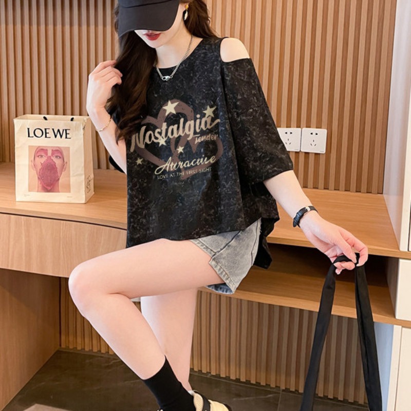 BY19060# 罗纹大码印花短袖t恤女夏季新款露肩上 服裝批發女裝批發服飾貨源